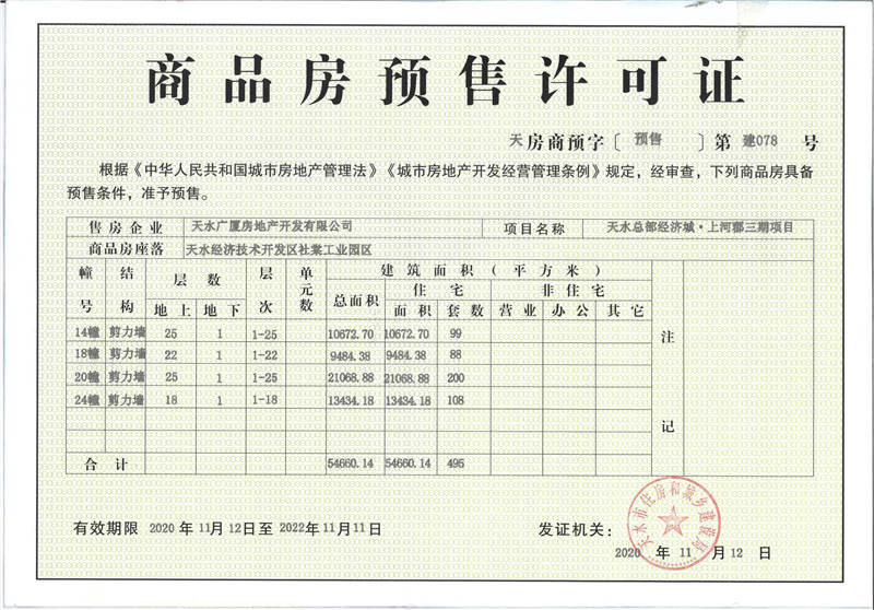 近日,天水上河郡三期項目取得商品房預(yù)售許可證,這是繼甘肅建投天水中心、上尚宅二期項目之后在手續(xù)報建上的又一重大突破,同時也標志著天水三個項目建設(shè)階段手續(xù)報建工作的圓滿完成;天水上河郡三期項目商品房預(yù)售許可證的取得為該項目11月22日開盤奠定了堅實基礎(chǔ)!同時也預(yù)示著天水上河郡三期預(yù)售工作即將全面拉開帷幕。