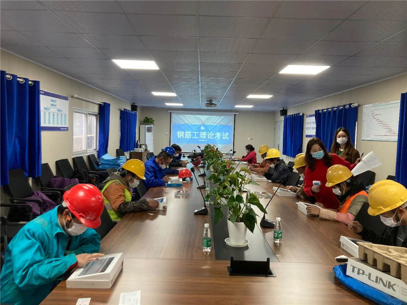 理論考試在百酈華庭項目部會議室進(jìn)行,由無錫市鑒定中心提供的移動式平板電腦上完成考試。