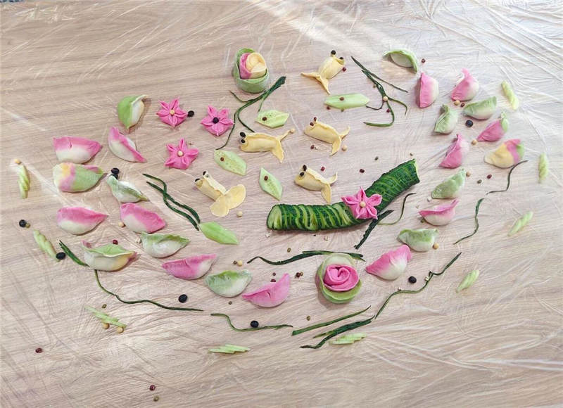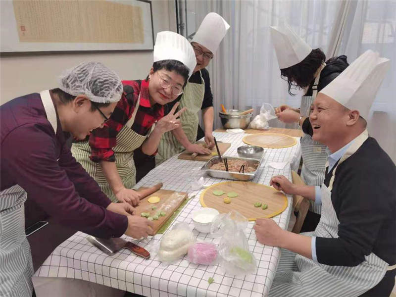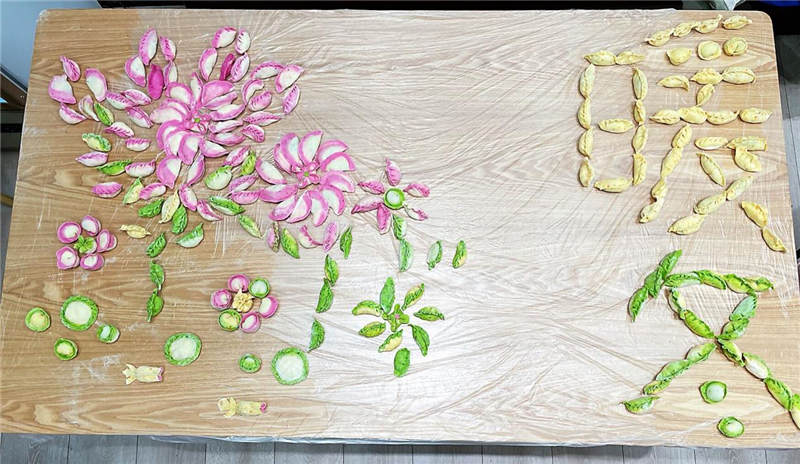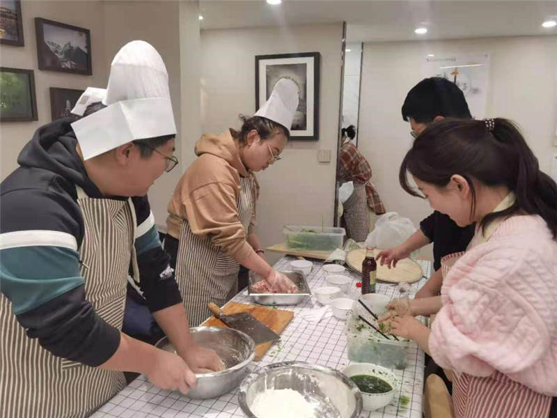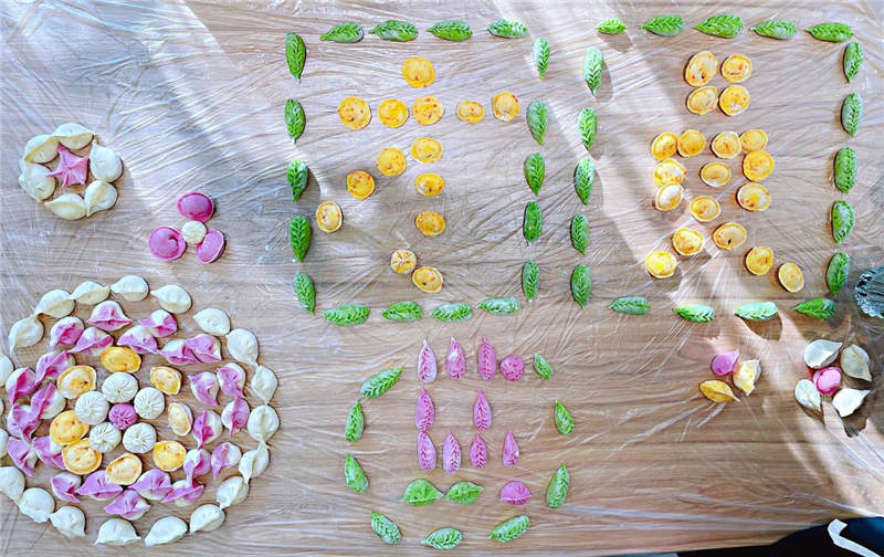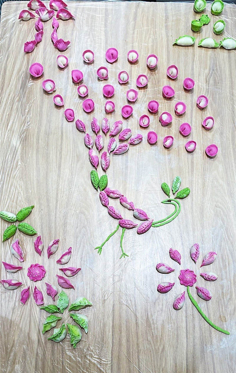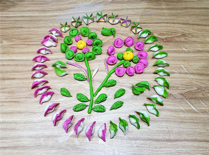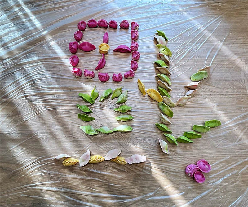 在活動中,大家分工協(xié)作,井然有序,有人和面、有人拌餡、有人搟皮、有人包褶。再看看大家包的餃子,形態(tài)不一、極具創(chuàng)意,餃子皮的更是用色大膽,紅的、黃的、綠的。