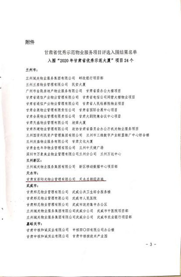 近日,天水上尚宅項目獲2020年度“甘肅省物業(yè)管理優(yōu)秀示范項目”,總部經(jīng)濟城獲2020年度“甘肅省物業(yè)管理優(yōu)秀示范大廈”。本次評選活動由12個地市申報的144個項目參與,評審委員會采取聽、看、談、訪、查等多種方式,對標對表對參選項目進行評選,歷時30余天,最終確定評選結(jié)果。