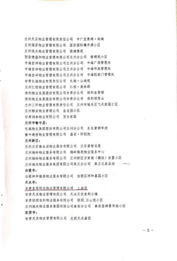 一直以來,在置業(yè)公司的領(lǐng)導(dǎo)下,宜居陽光物業(yè)嚴格按照“專業(yè)化,再專業(yè)化”的要求,著眼細節(jié)、規(guī)范操作,全力打造物業(yè)服務(wù)頂級、高端品牌形象。為進一步加強內(nèi)部管理,扎實做細、做精客服、保潔、秩序維護、設(shè)施設(shè)備維護保養(yǎng)等基礎(chǔ)工作,各物業(yè)中心對照《甘肅省省級示范物業(yè)項目服務(wù)評價標準》(住宅物業(yè))(公共物業(yè)),想業(yè)主所想,做貼心服務(wù),竭力為業(yè)主提供安全、文明、整潔、滿足業(yè)主需求并且持續(xù)改進的高品質(zhì)物業(yè)管理服務(wù),強化服務(wù)標準的落地,不斷提升服務(wù)品質(zhì),最終獲得了業(yè)主的廣泛好評、行業(yè)的認可和社會各界的贊譽。自2015年以來,蘭州建工瑞景、南河庭院、張掖濱河小鎮(zhèn)被評為“甘肅省優(yōu)秀住宅小區(qū)”,武威聚銀新都被評為“涼州區(qū)優(yōu)秀住宅小區(qū)”,天水上尚宅被評為“天水市第七批園林式居住區(qū)(單位)”,甘肅宜居陽光物業(yè)管理有限公司榮獲2019年甘肅省最佳物業(yè)企業(yè)提名獎和2020年度甘肅省疫情防控先進集體。