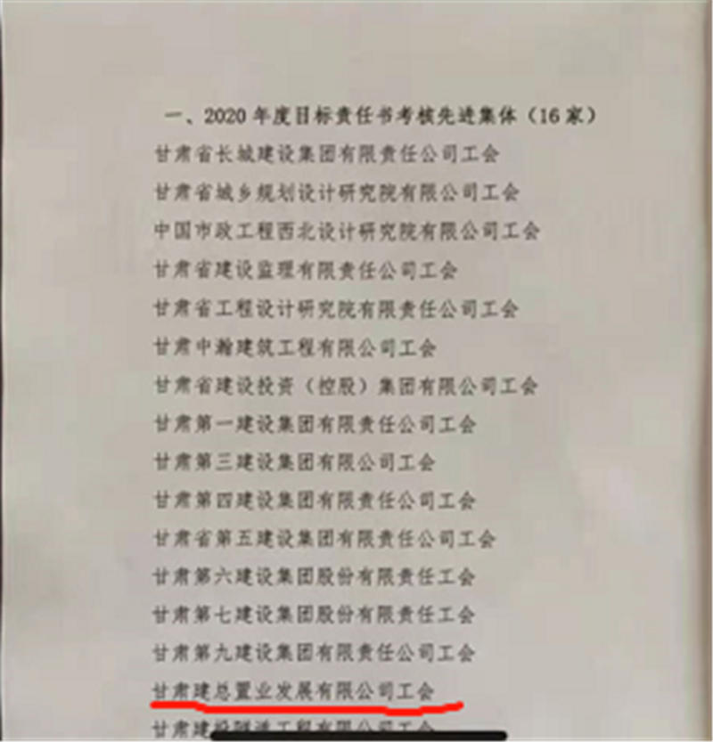 近日,置業(yè)公司工會(huì)在甘肅省建設(shè)工會(huì)委員組織的2020年度甘肅省建設(shè)工會(huì)目標(biāo)責(zé)任書考核中評(píng)為“2020年度目標(biāo)責(zé)任書考核先進(jìn)集體”。