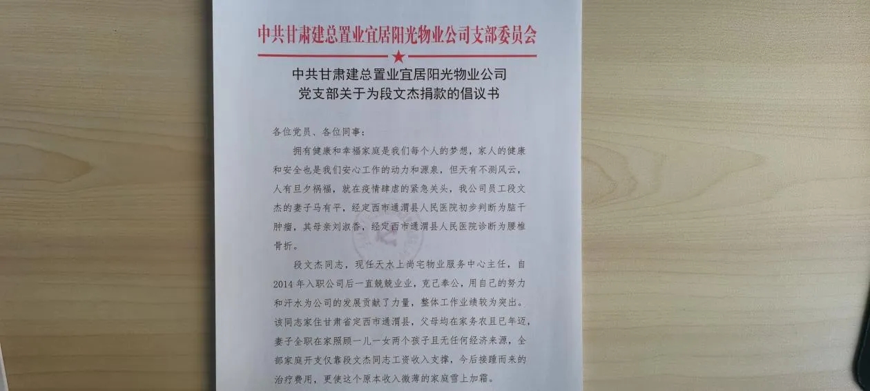 近日,物業(yè)公司天水上尚宅服務中心主任段文杰的妻子被醫(yī)院診斷為腦干腫瘤,其母被診斷為腰椎骨折,昂貴的治療費用使其家庭背上了沉重負擔,接踵而來的后期治療費用,使這個原本收入微薄的家庭雪上加霜。