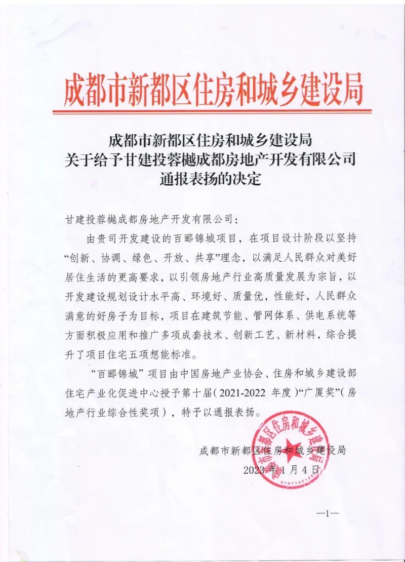 近日,成都市新都區(qū)城鄉(xiāng)和住房建設(shè)局對(duì)甘肅建總置業(yè)發(fā)展有限公司成都公司開(kāi)發(fā)建設(shè)的百酈錦城項(xiàng)目榮獲中國(guó)房地產(chǎn)業(yè)最高榮譽(yù)“廣廈獎(jiǎng)”(2021-2022年度)予以通報(bào)表?yè)P(yáng)。