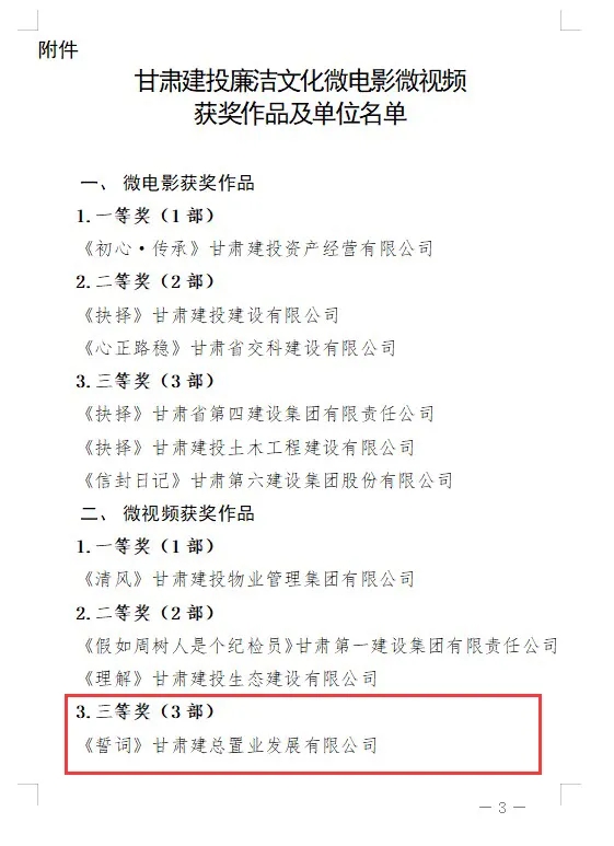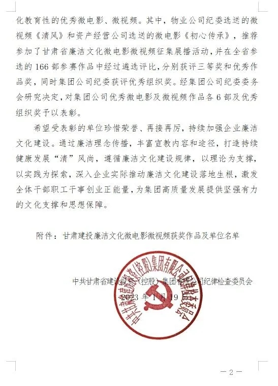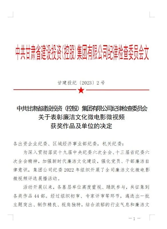 1月19日,在集團(tuán)公司紀(jì)委2022年開展的全司廉潔文化微電影微視頻評選展播活動中,公司紀(jì)委榮獲“甘肅建投廉潔文化微電影微視頻三等獎”榮譽(yù)稱號。