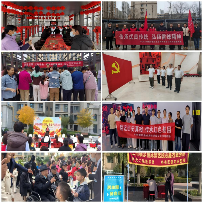 一是在蛇年春節(jié)前夕開展寫春聯(lián)送新春祝?;顒樱惺軅鹘y(tǒng)文化的獨特魅力。二是組織開展“學雷鋒 踐行動”主題黨日活動,把組織生活與業(yè)主環(huán)境整治工作有機結合,弘揚志愿精神,不僅幫助了生活困難的家庭,也美化了居住環(huán)境,進一步增強了黨員青年的服務意識、責任意識及表率意識,以實際行動踐行黨員的先進性。三是開展“慶六一、迎端午”小區(qū)文化活動,給孩子們提供一段快樂的時光,讓他們感受節(jié)日的快樂,同時也讓廣大業(yè)主品味傳統(tǒng)民俗文化,感受傳統(tǒng)節(jié)日的文化內涵,增進物業(yè)與業(yè)主的交流。四是組織黨員走進八路軍蘭州辦事處紀念館以及觀看《南京照相館》,從百年黨史和革命先烈英勇事跡中汲取奮進的力量,接受深刻的愛國主義洗禮和黨性教育。五是九九重陽佳節(jié)舉辦文藝匯演暨公益服務實踐活動,大力弘揚中華民族尊老、敬老、愛老、助老傳統(tǒng)美德。六是科普義診“請進來”,以實際行動踐行初心使命,把優(yōu)質、便捷的醫(yī)療服務送到居民身邊,為居民送溫暖、送健康。