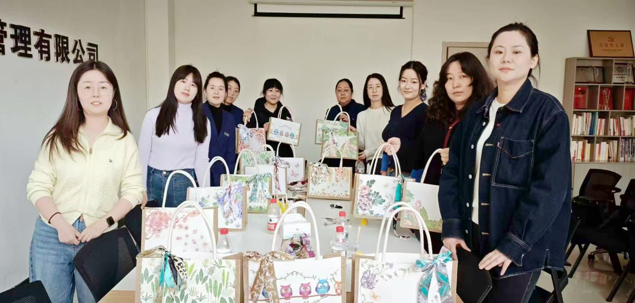 物業(yè)公司提前準(zhǔn)備了素色麻布包、防水膠、剪刀、復(fù)古花紋布料及裝飾配件,并推送學(xué)習(xí)視頻。女職工們圍坐在一起,先根據(jù)自己的喜好挑選花紋布料,將其裁剪成合適的形狀,再用防水膠仔細(xì)粘貼在麻布包表面,有的搭配復(fù)古碎花圖案,有的拼接幾何線條,還有的點(diǎn)綴小珍珠和絲帶,每個人都專注地設(shè)計著屬于自己的獨(dú)特包袋。