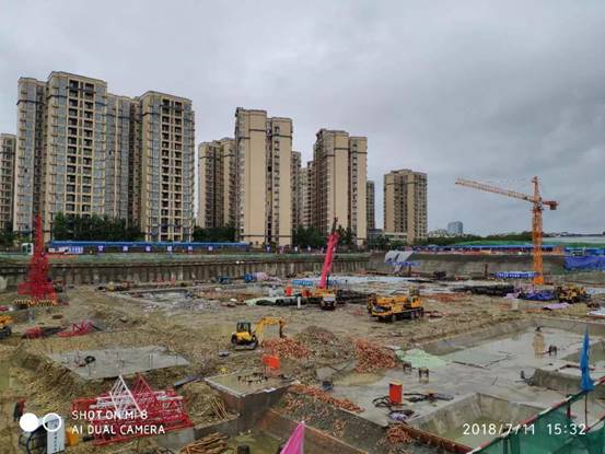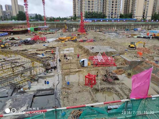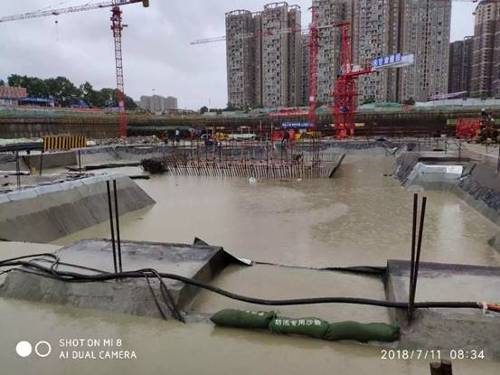 2018年7月,成都遭遇57年來最大降雨,多地出現(xiàn)暴雨橙色預警,四川省啟動II級防汛應急響應。為切實做好防暴雨安全措施,嚴防工地洪澇事故發(fā)生,百酈錦城的青年們組織各方,齊心協(xié)力、緊密協(xié)作,積極開展防汛抗災工作。迅速成立防汛工作領導小組,提前安排部署,啟動防汛搶險應急預案。各單位負責人親赴防汛一線,實地巡查,及時了解汛情。在施工現(xiàn)場張貼防汛標語、設置警戒線,加強防汛沙袋、水泵、汽油等防汛物資的儲備,打好防汛前戰(zhàn)。實行24小時值班制度,專人守護、實時監(jiān)控,密切監(jiān)視汛情,加強汛情信息分析預測、預報、預警,加大對基坑四周的巡查力度,密切關注基坑沉降情況,針對基坑積水、土釘墻漏水等問題,使用挖機挖掘溝道、集水坑,利用水泵抽水至市政管道排走,保障基坑周邊的降水井正常降水。此外,為防止市政停電,現(xiàn)場配備柴油發(fā)電機,保證在停電后一個小時內,迅速恢復降水。同時加強臨電管控,有雨時除降水井用電外,其余配電箱全部停電。停雨后,分級檢查各設備情況,確認無隱患后,逐級送電。合理分配救災力量,搶險救災有條不紊進行,確保百酈錦城項目安然無恙。