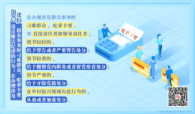 《中國共產(chǎn)黨紀(jì)律處分條例》第一百二十二條規(guī)定,在辦理涉及群眾事務(wù)時刁難群眾、吃拿卡要,對直接責(zé)任者和領(lǐng)導(dǎo)責(zé)任者,情節(jié)較輕的,給予警告或者嚴(yán)重警告處分;情節(jié)較重的,給予撤銷黨內(nèi)職務(wù)或者留黨察看處分;情節(jié)嚴(yán)重的,給予開除黨籍處分。